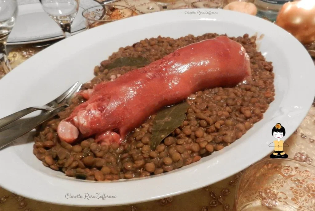 レンズ豆と、ザンポーネかコテキーノを食べる。どちらも大きな豚肉のソーセージで、腸詰めか、豚の脚の皮で包まれている。