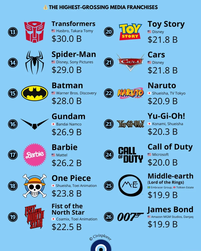 海外コミュニティのredditから「2025年12月時点での、歴史上もっとも収益を上げたメディアフランチャイズ一覧」という投稿を翻訳してお届けします。