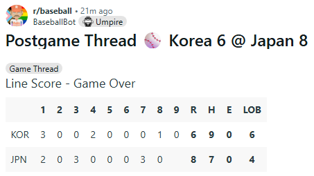 海外コミュニティのredditから「Postgame Thread ⚾ Korea 6 @ Japan 8」という投稿を翻訳してお届けします。